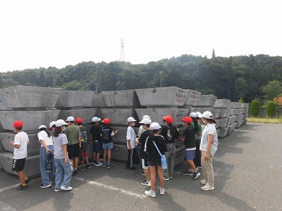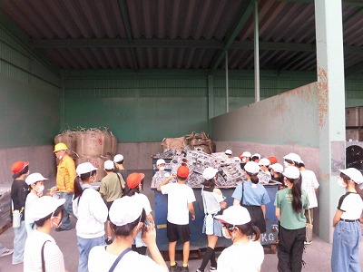 アルミ缶リサイクルの流れについて説明を行った後、実際に現場へ出て、スクラップや出来上がったインゴット製品を見て、触れてもらいました。リサイクルについて深く興味を抱いている様子でした。
